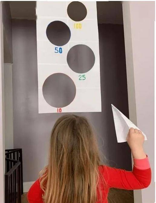 在门框上挂一张纸,纸上挖几个不同大小的洞,飞机通过洞就得分,越小的洞分值越高。还可以设置阶段奖励,爸爸妈妈可以和孩子比赛,看谁得分最高赢大奖。