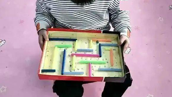 先给孩子找一个适合他端着的纸箱,再给他拿来卡纸和吸管,让他自己把箱子的底部铺上卡纸,将吸管剪成不同的长短,设计出一个小迷宫。